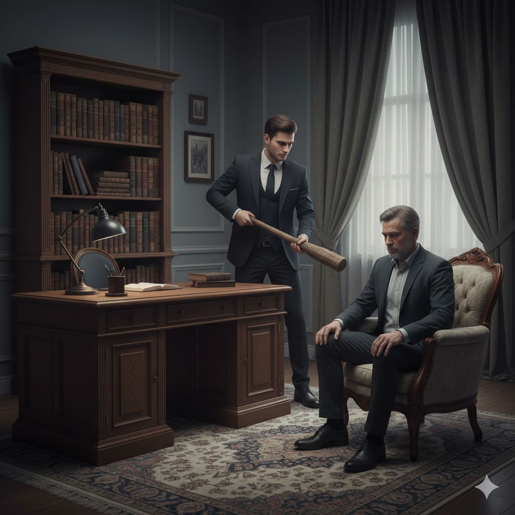 سپس چماق را بالا برد و با تمام توان به سر دکتر ضربه زد. دکتر برای جلوگیری از ضربه دستش را سپر خود کرد. ضربه بعدی و ضربه بعدی. به ناگهان در مطب باز شد و منشی به همراه سه مرد وارد شدند. منشی جیغی کشید و داد زد:« دکتر خودشو کشت»